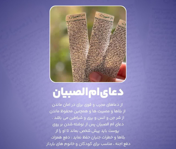 از دعاهای مجرب و قوی برای در امان ماندن از بلاها و مصیبت ها و همچنین محفوظ ماندن از شر جن و انس و پری و شیاطین می باشد . دعای ام الصبیان پس از نوشته شدن بر روی پوست باید پیش شخص بماند تا او را از بلاها و خطرات جنیان حفظ نماید